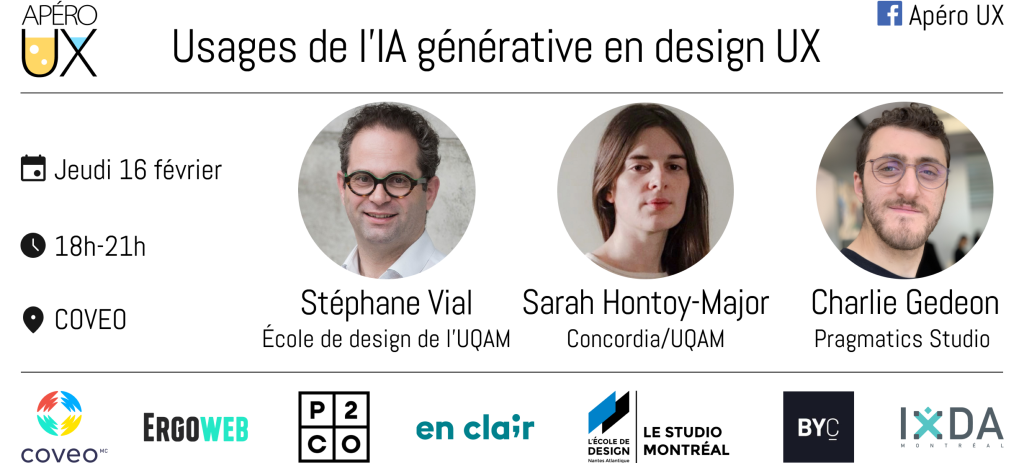 L’Apéro UX se tiendra en compagnie de Stéphane Vial, Sarah Hontoy-Major et Charlie Gedeon.